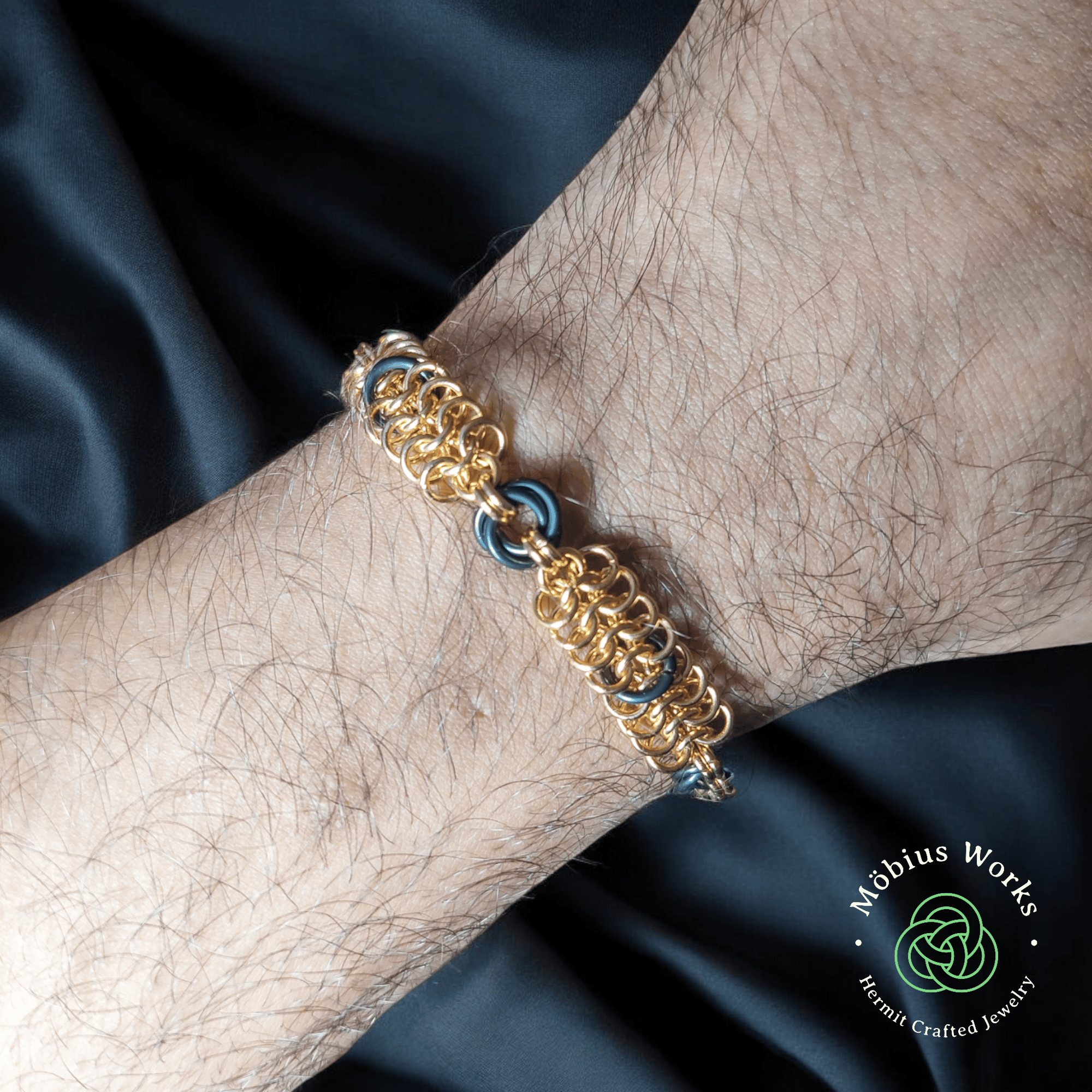 Black Glass titanium and gold plated stainless piece using European 4 in 1 weave with a jens pind weave to link them together