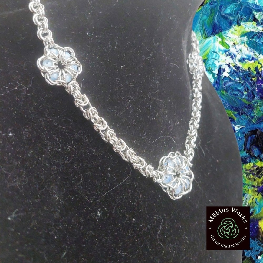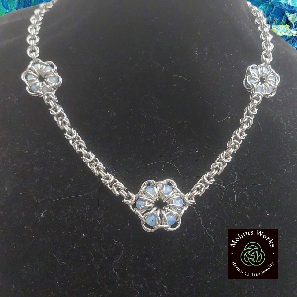 100% stainless. Combination of captured beads, byzantine and möbius knots